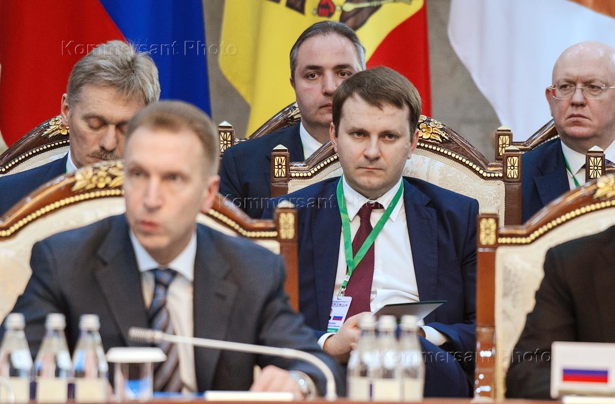 Заседание Высшего Евразийского экономического совета на уровне глав государств в расширенном составе прошло в резиденции "Ала-Арча". Слева направо: заместитель руководителя администрации президента России, пресс-секретарь президента Дмитрий Песков, первый заместитель председателя правительства России Игорь Шувалов и министр экономического развития России Максим Орешкин во время заседания.