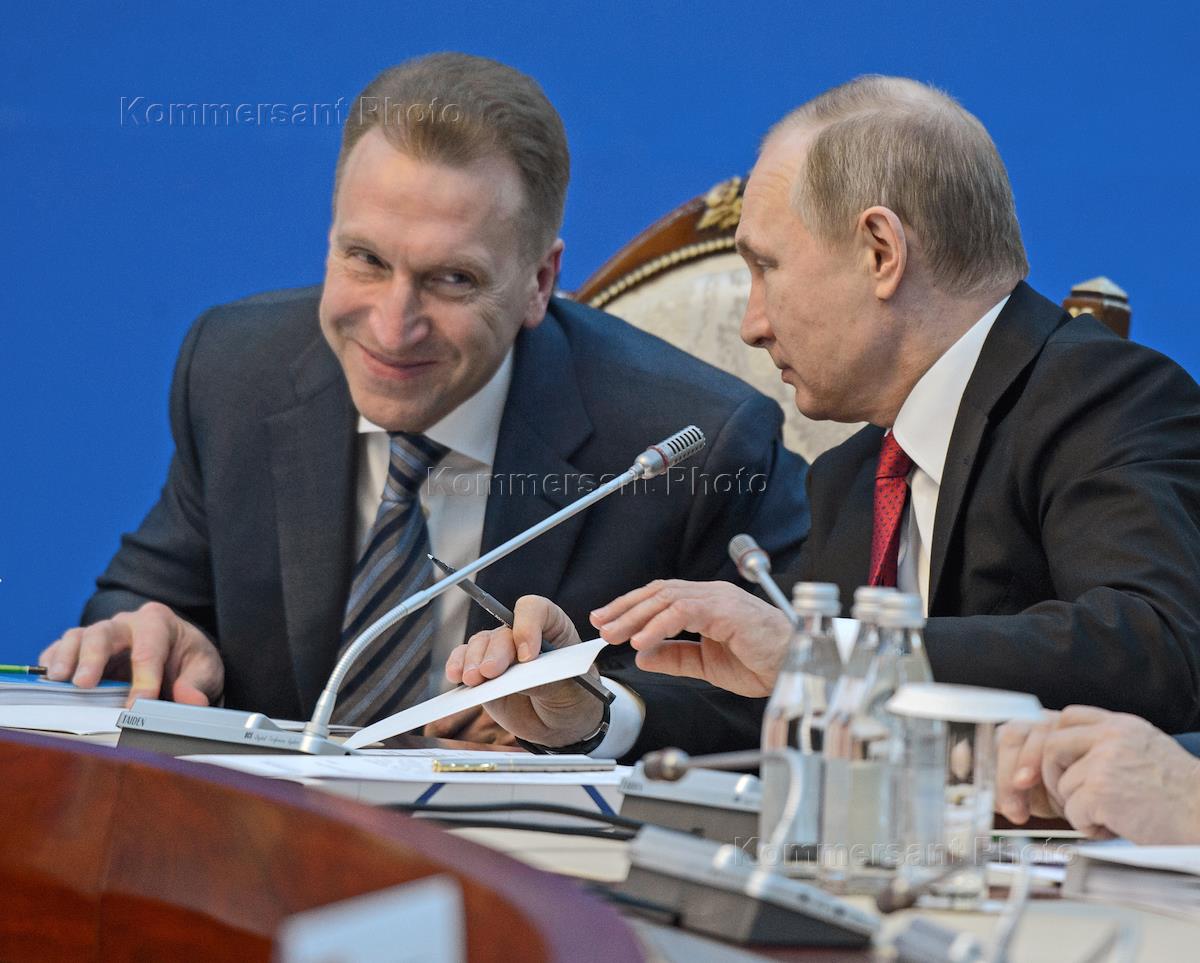 Заседание Высшего Евразийского экономического совета на уровне глав государств в расширенном составе прошло в резиденции "Ала-Арча". Президент России Владимир Путин (справа) и первый заместитель председателя правительства России Игорь Шувалов (слева) во время заседания.