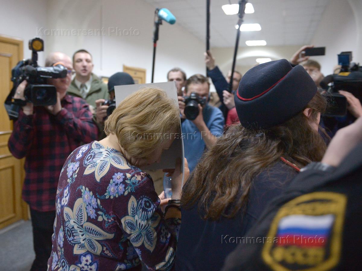 Генеральный директор ООО "Телекомпания 12 регион" Наталия Кожанова (в центре), обвиняемой обвиняемой в совершении преступлений, предусмотренной ч. 4 ст.291.1 УК РФ, перед началом заседания в Басманном суде.