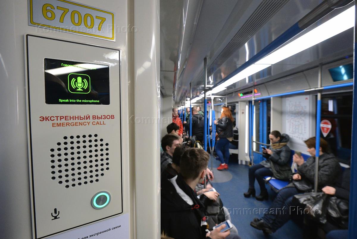 Церемония запуска поезда нового поколения "Москва" на Таганско-Краснопресненской линии. Панель экстренного вызова в вагоне поезда.