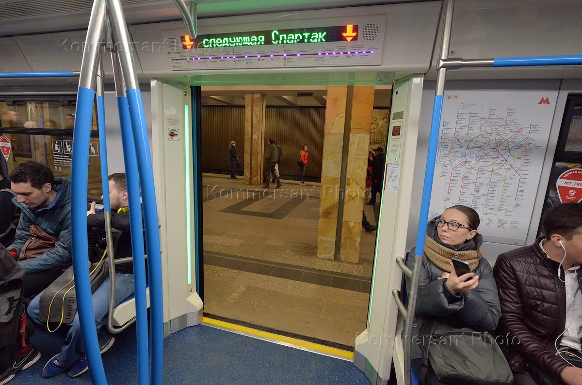 Passengers are seen during launching ceremony of new-generation Moskva trains at Moscow subway.