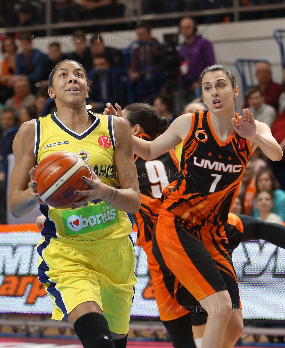 Евролига по баскетболу среди женских команд. Матч между командами "УГМК" (Екатеринбург, Россия) и "Фенербахче" (Стамбул, Турция) прошел во Дворце игровых видов спорта. Игрок команды "УГМК" Бриттни Грайнер (справа) во время матча.