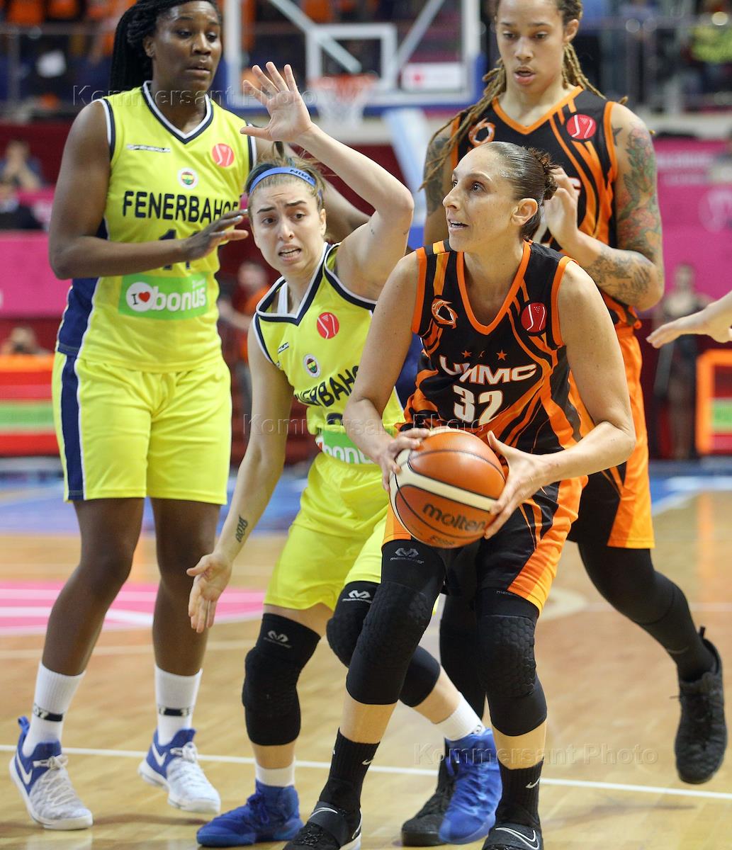 Евролига по баскетболу среди женских команд. Матч между командами "УГМК" (Екатеринбург, Россия) и "Фенербахче" (Стамбул, Турция) прошел во Дворце игровых видов спорта. Игрок команды "УГМК" Бриттни Грайнер (справа) во время матча.