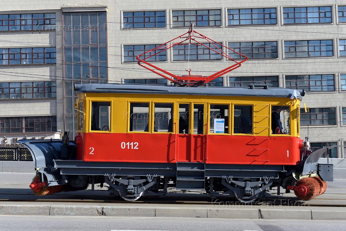 Ежегодный праздник московского трамвая, посвященный 118-й годовщине открытия движения, на Чистопрудном бульваре. Рельсоочистительный вагон во время пробега.