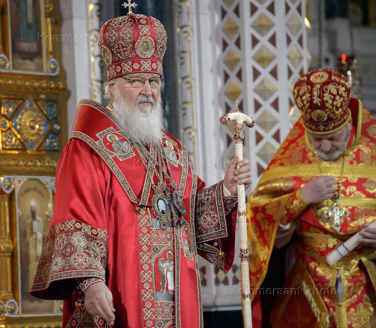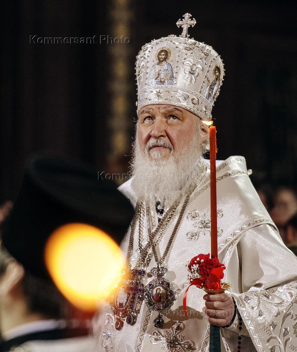 Пасхальная заутреня и Божественная литургия в кафедральном соборном Храме Христа Спасителя. Патриарх Московский и Всея Руси Кириллво время пасхальной службы.