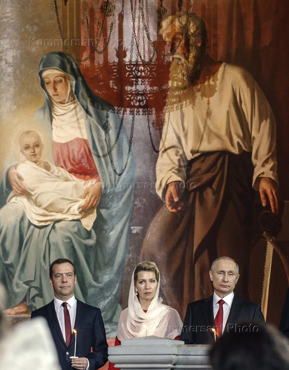 Пасхальная заутреня и Божественная литургия в кафедральном соборном Храме Христа Спасителя. Слева направо: председатель правительства России Дмитрий Медведев, супруга председателя правительства России Светлана Медведева и президент России Владимир Путин во время пасхальной службы.