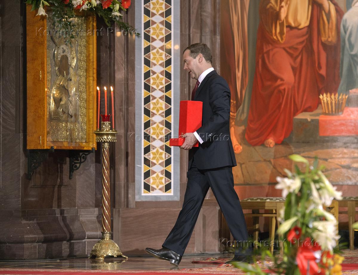 Пасхальная заутреня и Божественная литургия в кафедральном соборном Храме Христа Спасителя. Председатель правительства России Дмитрий Медведев перед началом пасхальной службы.