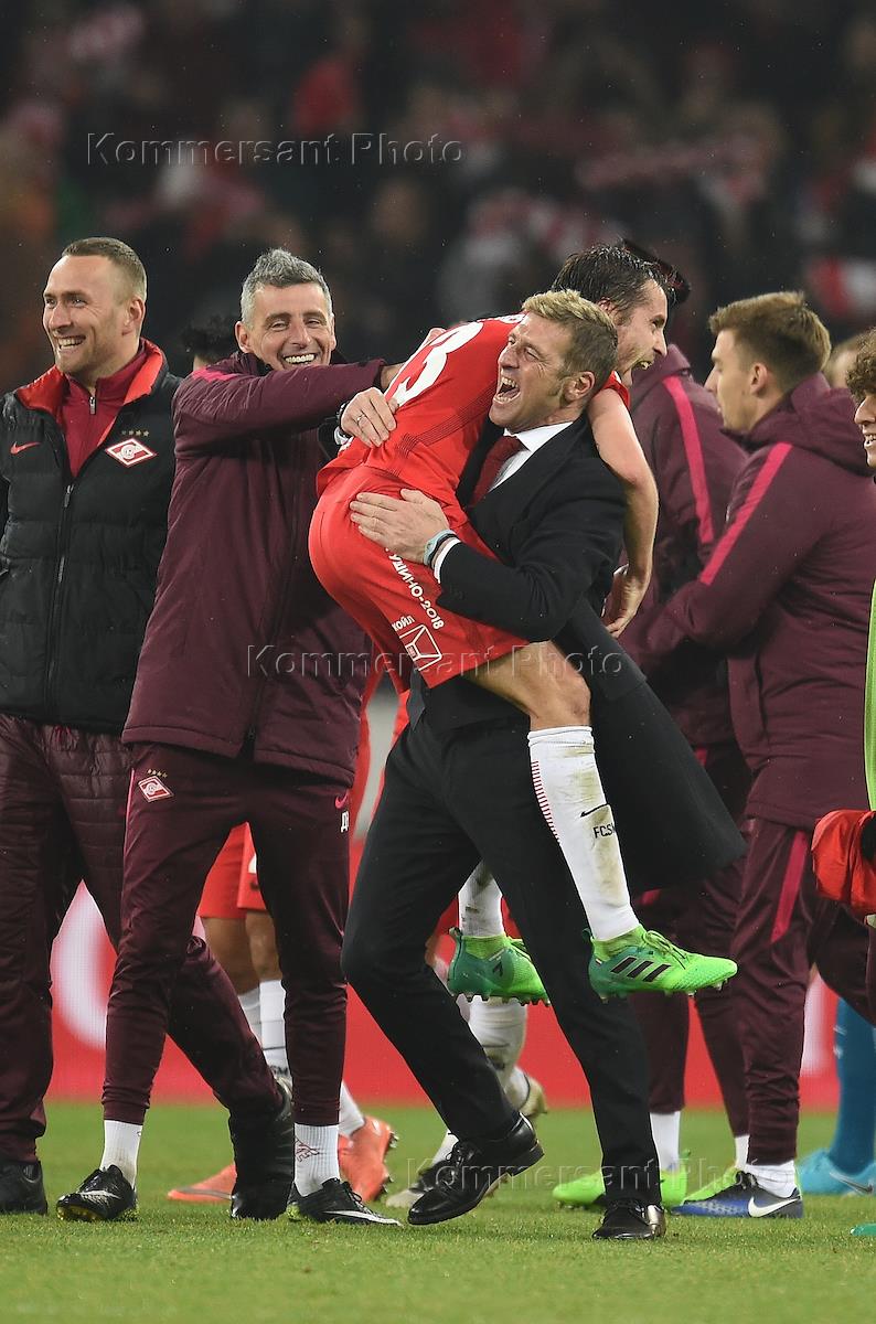 РОСГОССТРАХ Чемпионат России по футболу 2016/2017. 23-й тур. Матч между командами "Спартак" (Москва) - "Зенит" (Санкт-Петербург) прошел на стадионе "Открытие Арена". Игрок команды "Спартак" Дмитрий Комбаров (в центре) и главный тренер команды "Спартак" Массимо Каррера (справа) во время матча.