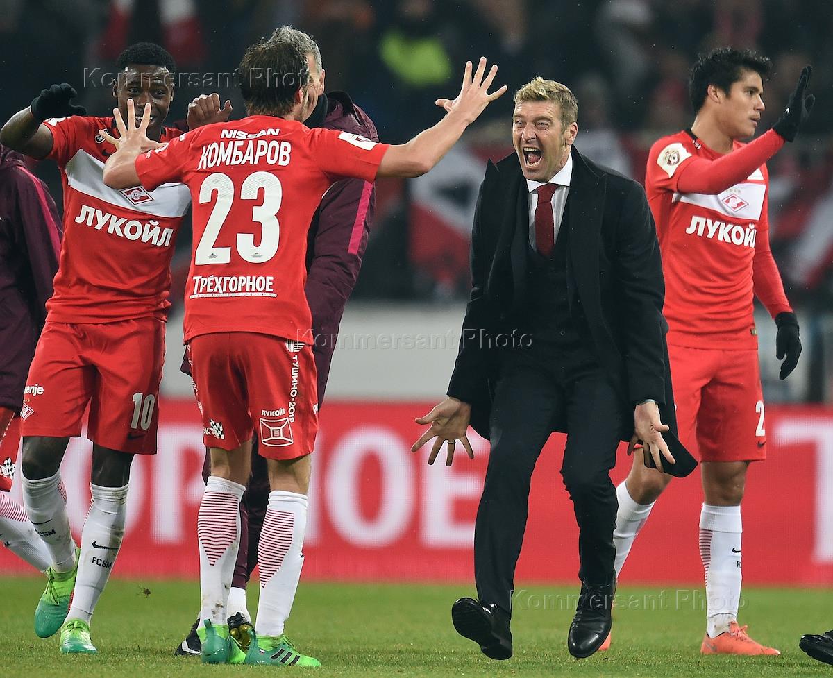 РОСГОССТРАХ Чемпионат России по футболу 2016/2017. 23-й тур. Матч между командами "Спартак" (Москва) - "Зенит" (Санкт-Петербург) прошел на стадионе "Открытие Арена". Игрок команды "Спартак" Дмитрий Комбаров (в центре) и главный тренер команды "Спартак" Массимо Каррера (справа) во время матча.