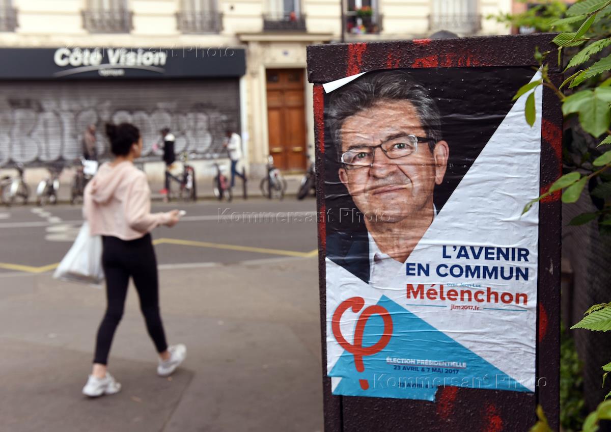 Предвыборная агитация в Париже. Плакаты с портретом кандидата на пост президента Франции на улице города.