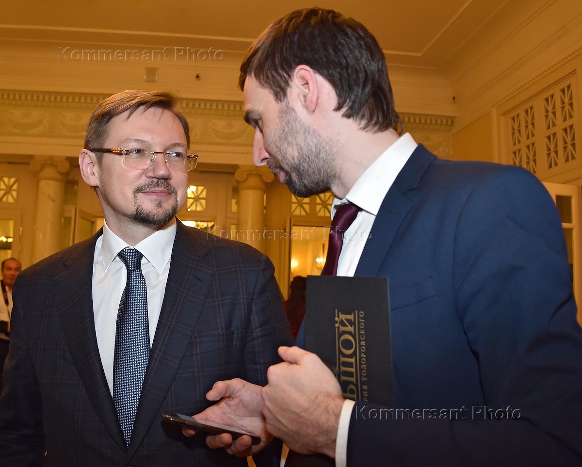 Премьера фильма режиссера Валерия Тодоровского "Большой" прошла в Государственном академическом Большом театре (ГАБТ). Слева направо: генеральный директор телеканала "Россия-1", первый заместитель генерального директора ВГТРК, член совета директоров "Ростелекома" Антон Златопольский (слева) и режиссер Валерий Тодоровский (справа) на премьере.