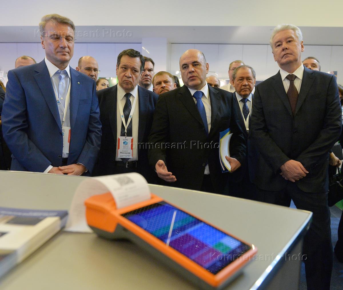 Всероссийская конференция "Онлайн-кассы - новые возможности ритейла" прошла в Конгресс—парке гостиницы "Рэдиссон Ройал Москва". Слева направо: президент, председатель правления Сбербанка России Герман Греф, председатель комитета Государственной думы России по бюджету и налогам Андрей Макаров, руководитель Федеральной налоговой службы России Михаил Мишустин, советник главы Республики Башкортостан, помощник первого заместителя председателя правительства России Геннадий Букаев и мэр Москвы Сергей Собянин на выставке инновационных контрольно-кассовых аппаратов.