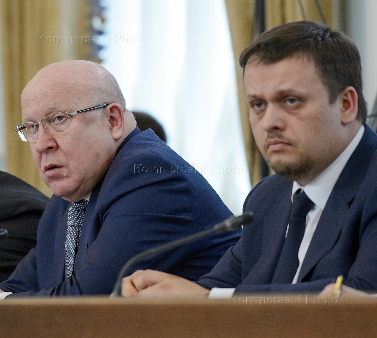 Рабочая поездка президента России Владимира Путина в Великий Новгород. Временно исполняющий обязанности губернатора Новгородской области Андрей Никитин (слева) и министр экономического развития России Максим Орешкин во время заседания президиума Государственного совета по вопросу "О национальной системе защиты прав потребителей".