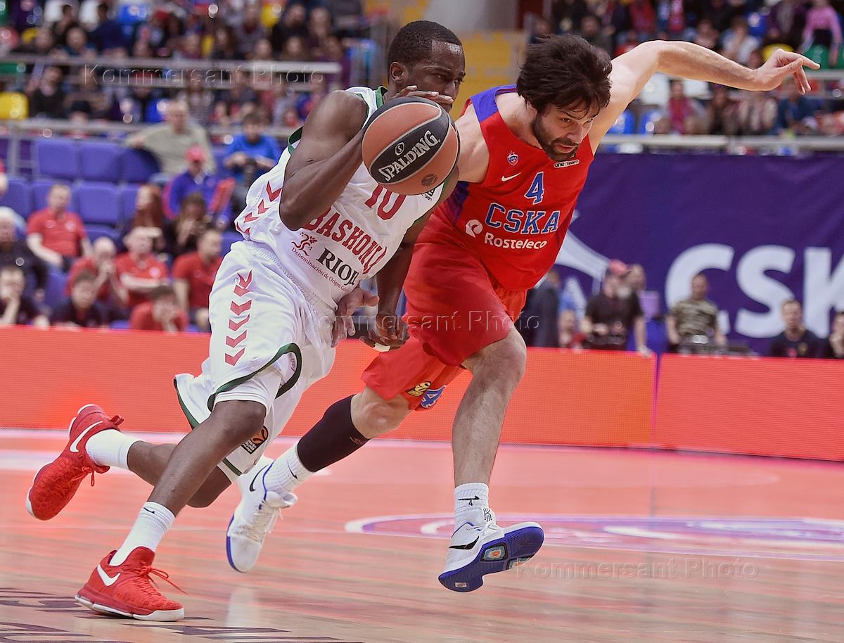 Евролига по баскетболу. Матч между командами ЦСКА (Москва, Россия) и "Баскония" (Витория, Испания) во дворце спорта "Мегаспорт". Игрок команды ЦСКА Никита Курбанов (слева) во время матча.