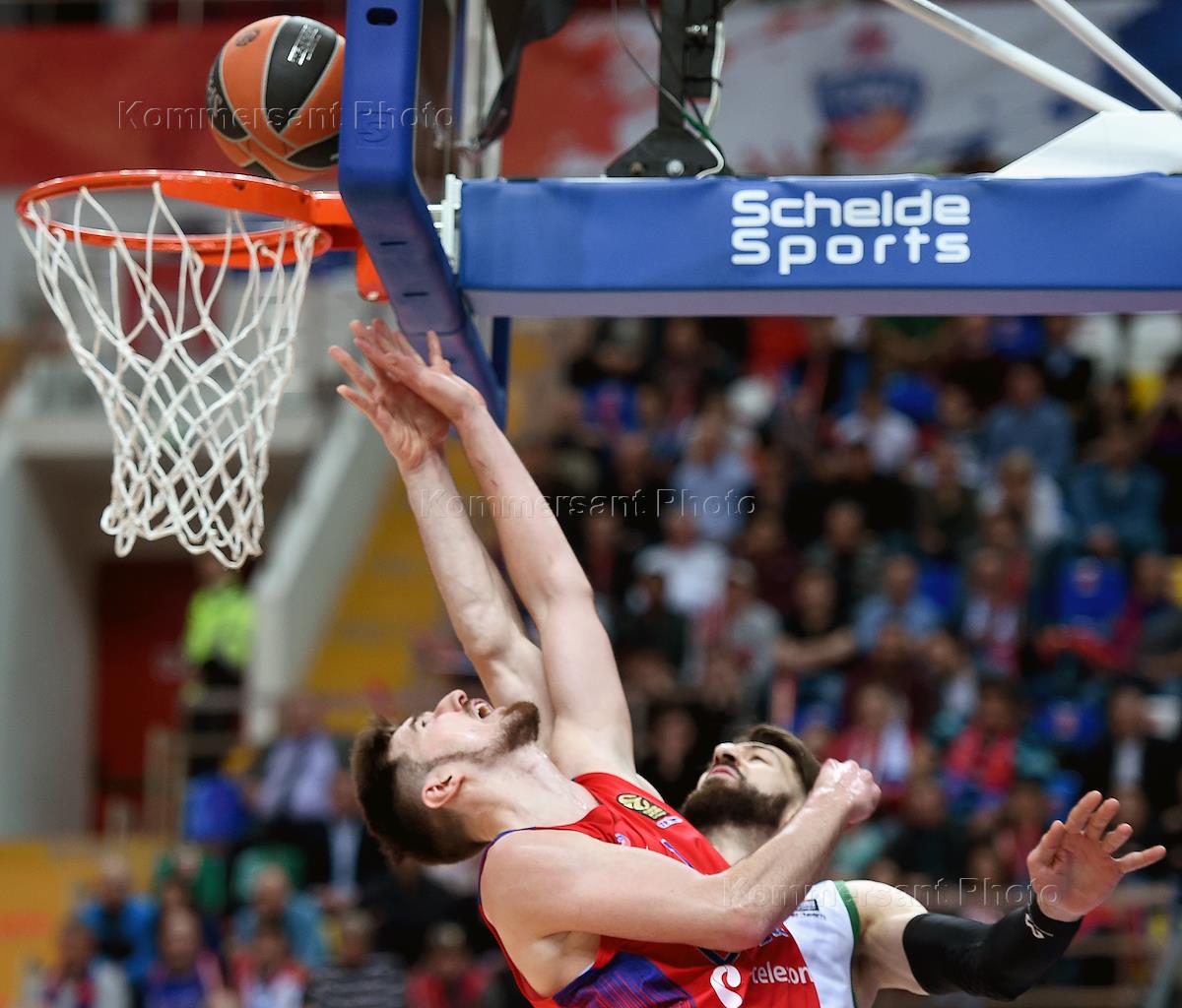Евролига по баскетболу. Матч между командами ЦСКА (Москва, Россия) и "Баскония" (Витория, Испания) во дворце спорта "Мегаспорт". Игрок команды ЦСКА Никита Курбанов (слева) во время матча.