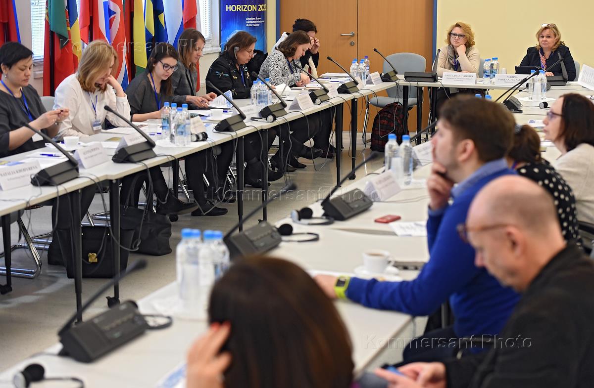 Круглый стол на тему "Домашнее насилие" в представительстве Европейской комиссии в России. Председатель правления ООО "Анна" Марина Писклакова-Паркер (слева) во время заседания.