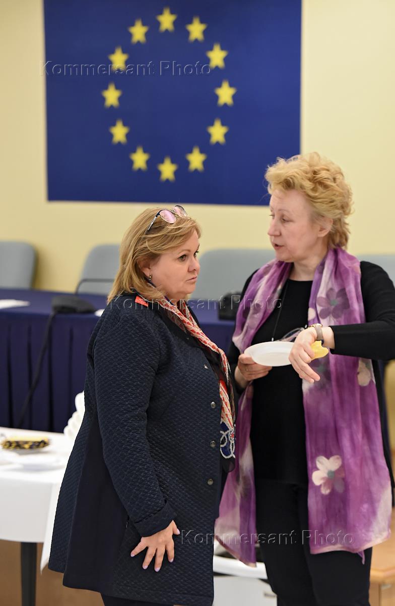 Круглый стол на тему "Домашнее насилие" в представительстве Европейской комиссии в России. Председатель правления межрегиональной общественной организации (МОО) поддержки семьи, материнства и детства "Врачи детям" (Санкт-Петербург) Светлана Суворова (слева) и председатель правления ООО "Анна" Марина Писклакова-Паркер во время заседания.