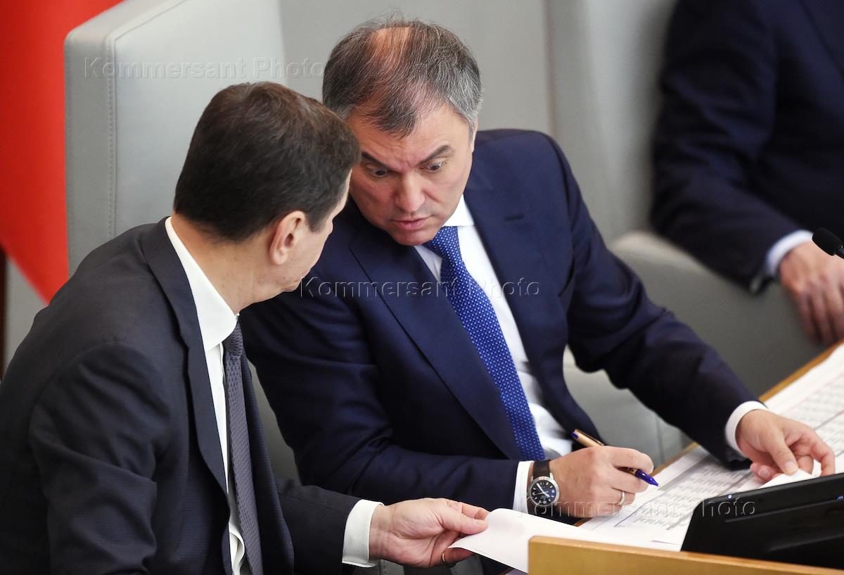 Председатель правительства России Дмитрий Медведев (справа) и председатель Государственной думы (ГД) России Вячеслав Володин (слева) во время пленарного заседания ГД России.