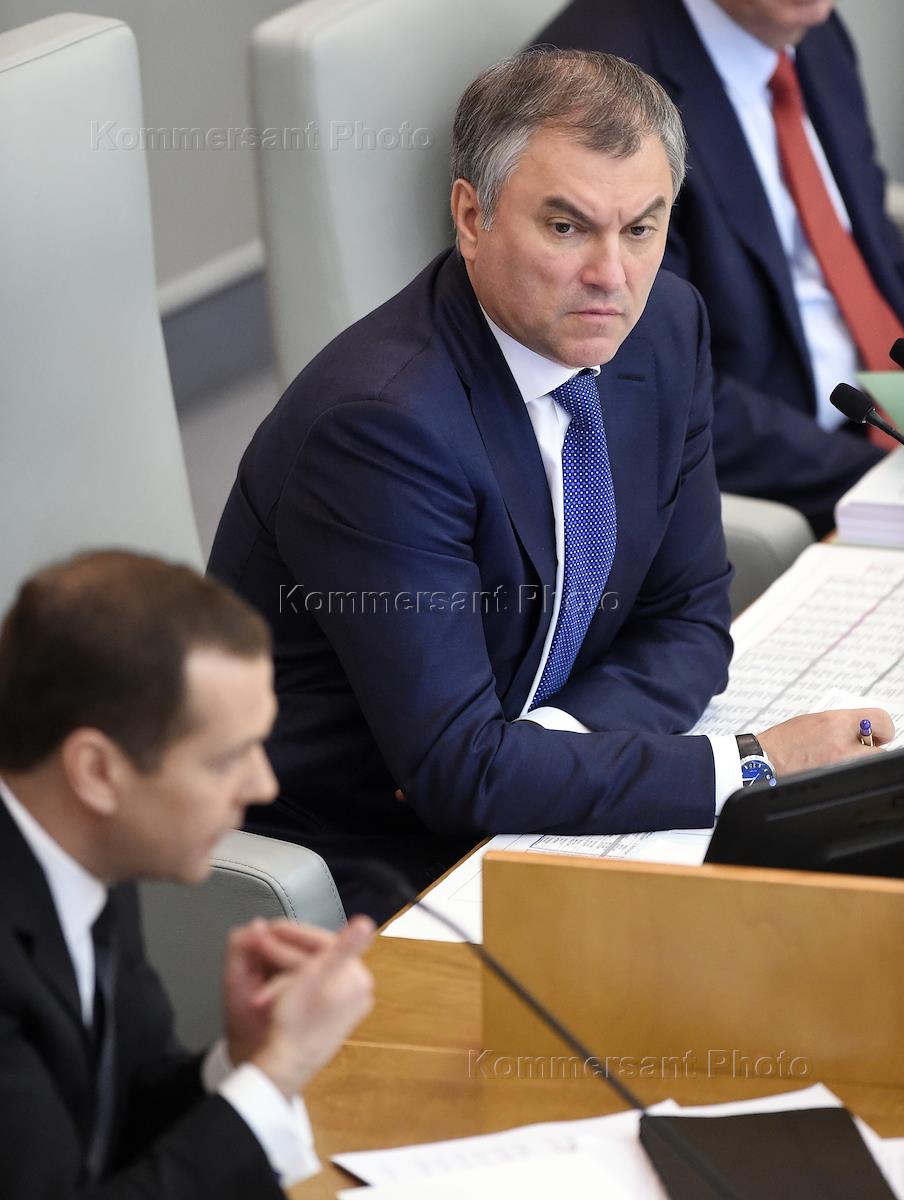 Председатель правительства России Дмитрий Медведев (справа) и председатель Государственной думы (ГД) России Вячеслав Володин (слева) во время пленарного заседания ГД России.