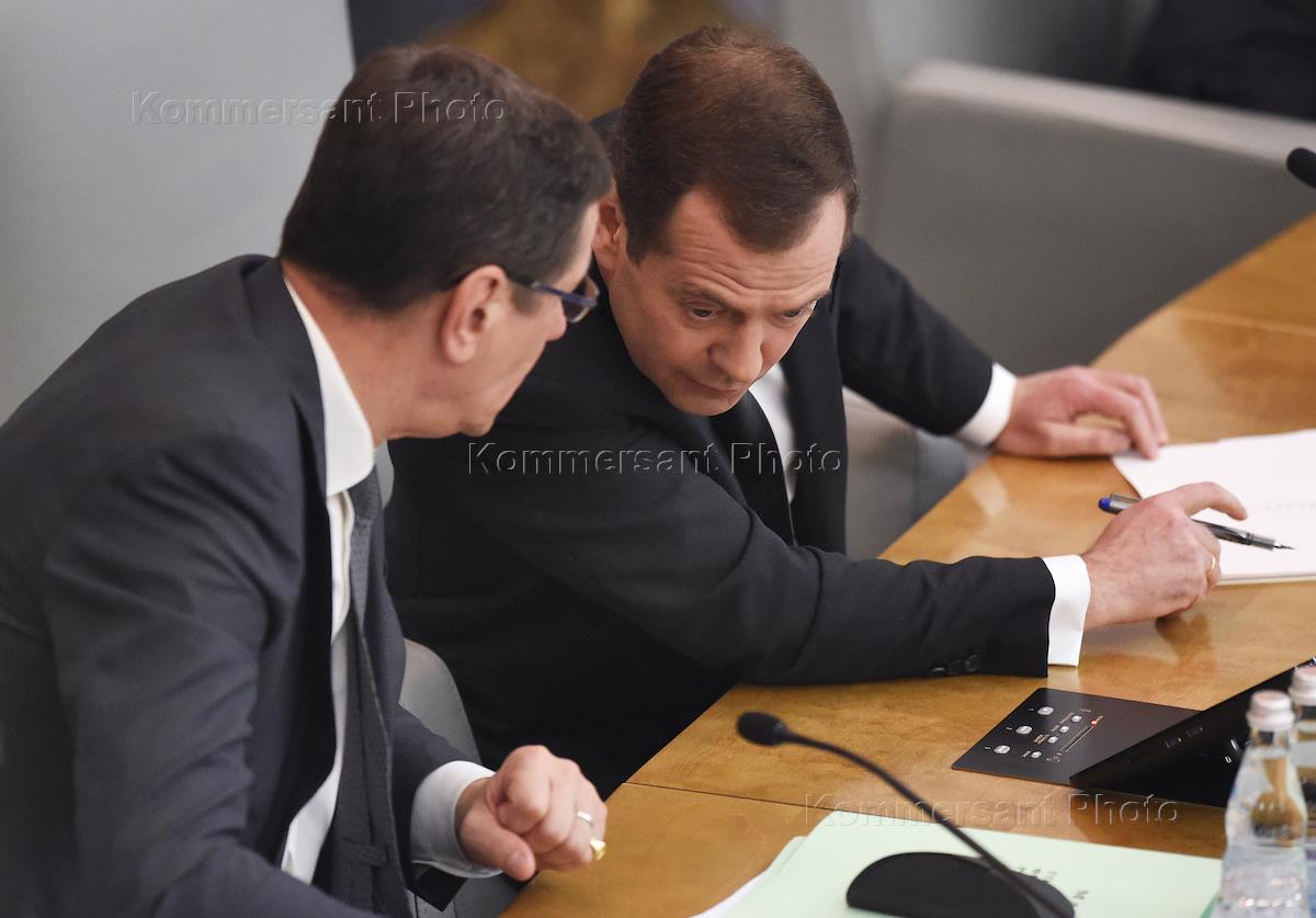 Пленарное заседание Государственной думы (ГД) России с участием председателя правительства России Дмитрия Медведева. Первый заместитель председателя ГД России Александр Жуков (слева) и председатель правительства России Дмитрий Медведев (справа) во время заседания.