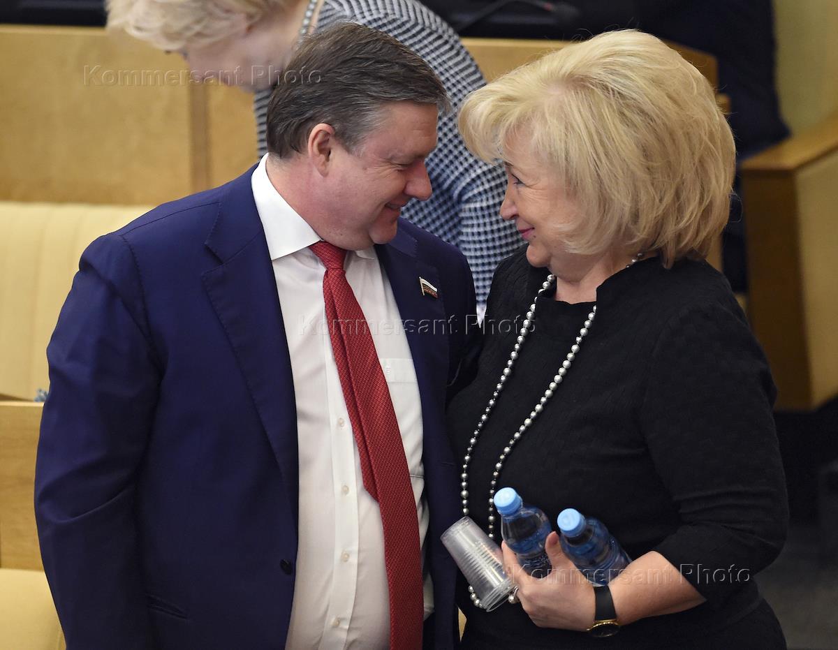 Пленарное заседание Государственной думы (ГД) России с участием председателя правительства России Дмитрия Медведева. Член комитета ГД России по безопасности и противодействию коррупции Георгий Карлов (слева) и член комитета ГД России по федеративному устройству и вопросам местного самоуправления Елена Вторыгина (справа) перед началом заседания.