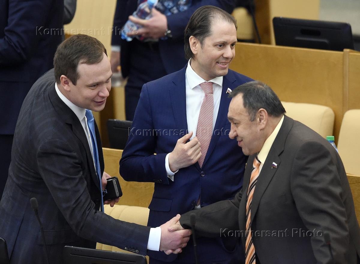 Пленарное заседание Государственной думы (ГД) России. Слева направо: член комитета ГД России по финансовому рынку Данил Шилков, член комитета ГД по экономической политике, промышленности, инновационному развитию и предпринимательству Владимир Сысоев и первый заместитель председателя комитета ГД по природным ресурсам, собственности и земельным отношениям Василий Тарасюк во время заседания.