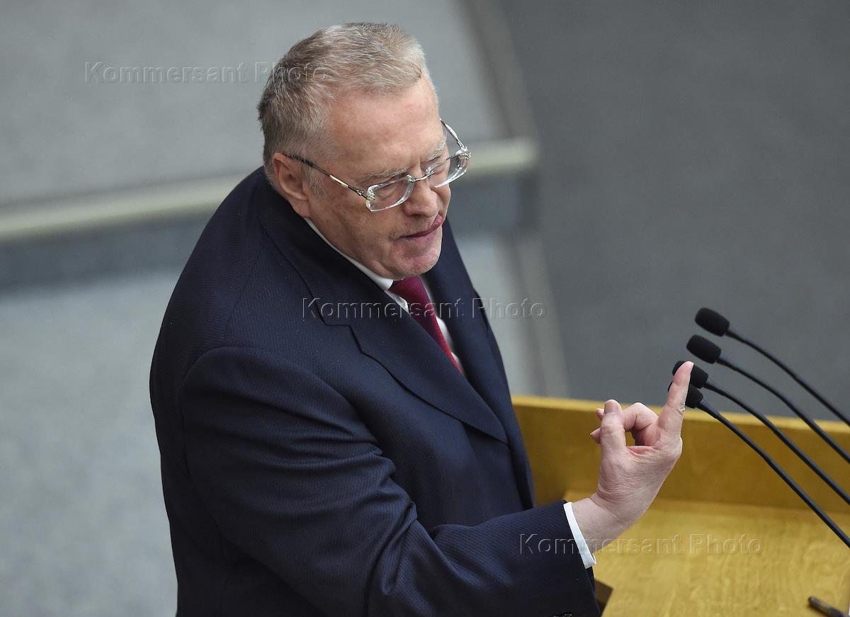 Пленарное заседание Государственной думы России с участием председателя правительства России Дмитрия Медведева. Лидер Либерально-демократической партии России (ЛДПР) Владимир Жириновский во время выступления на заседании.