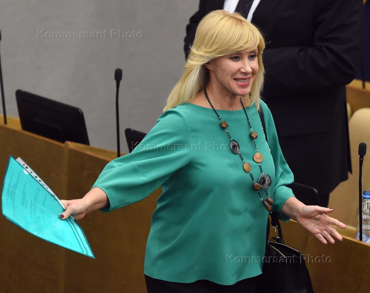 Пленарное заседание Государственной думы (ГД) России с участием председателя правительства России Дмитрия Медведева. Заместитель председателя комитета ГД по вопросам семьи, женщин и детей Оксана Пушкина перед началом заседания.