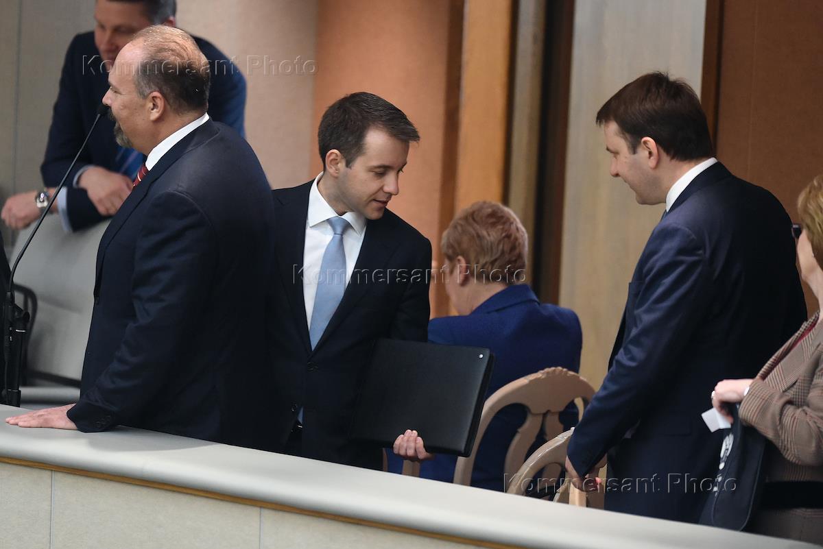 Пленарное заседание Государственной думы (ГД) России. Слева направо: министр строительства и жилищно-коммунального хозяйства России Александр Мень, министр связи и массовых коммуникаций России Николай Никифоров и министр экономического развития России Максим Орешкин во время заседания.