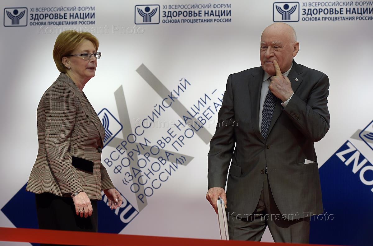 XI Всероссийский форум "Здоровье нации – основа процветания России" прошел в Гостином дворе. Министр здравоохранения России Вероника Скворцова (слева) и директор Научно-исследовательского центра сердечно-сосудистой хирургии имени А.Н.Бакулева Лео Бокерия (справа) во время церемонии открытия форума.