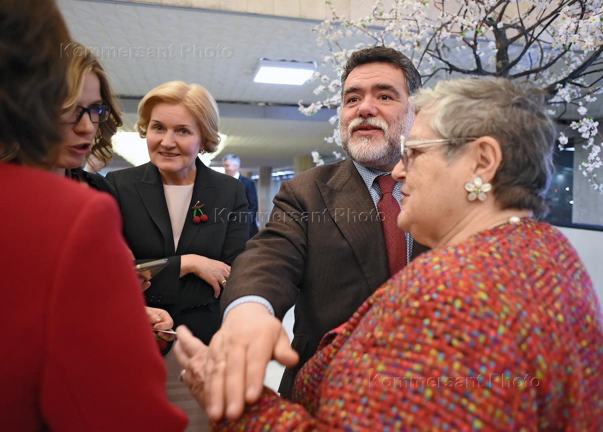 XVII открытый фестиваль искусств "Черешневый лес". Церемония открытия выставки "Джорджо де Кирико. Метафизические прозрения" в Государственной Третьяковской галерее. Директор Государственной Третьяковской галереи Зельфира Трегулова (в центре) и заместитель председателя правительства России Ольга Голодец (справа) во время церемонии.