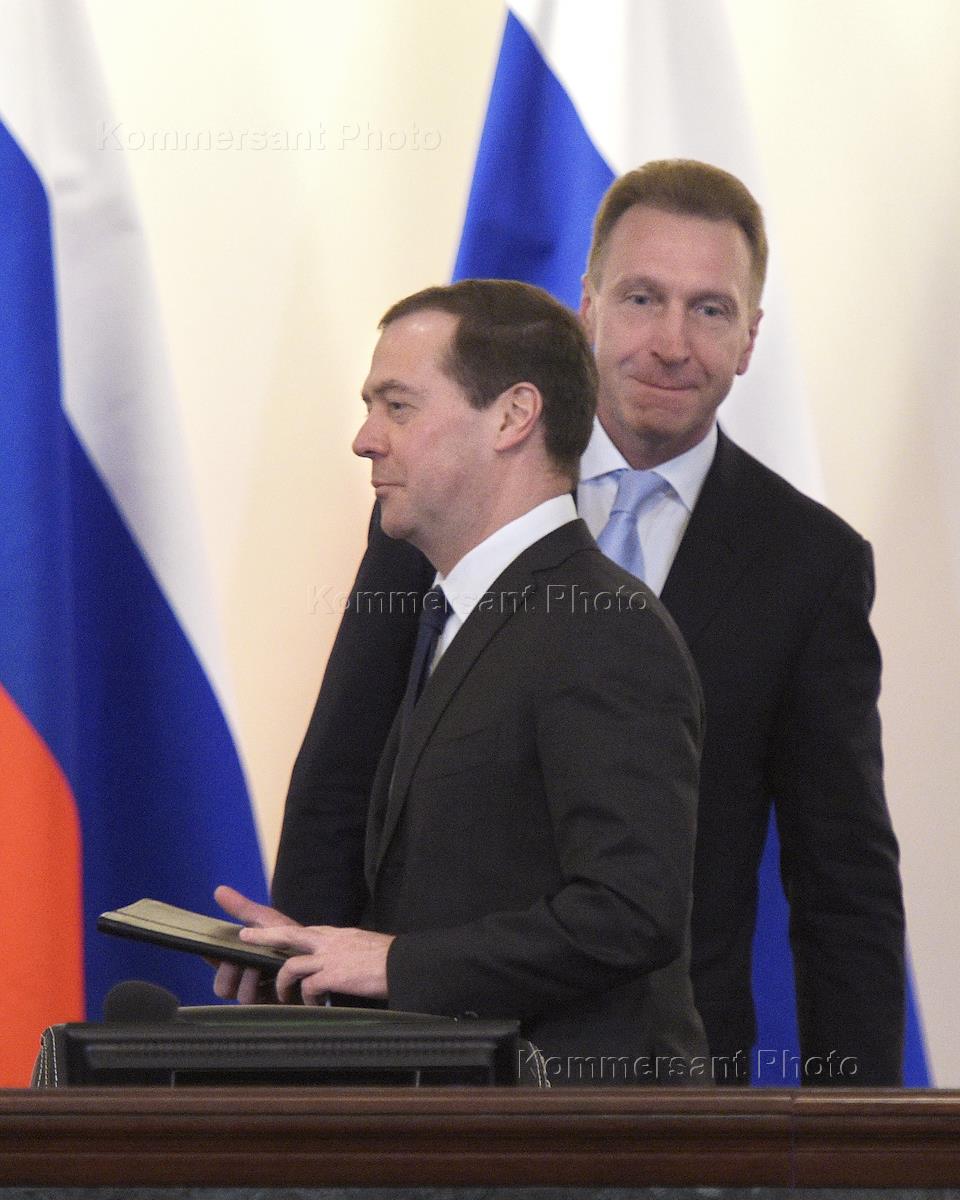 Расширенное заседание коллегии Министерства финансов (Минфин) России в здании Минфина России. Слева направо: первый заместитель председателя правительства России Игорь Шувалов, председатель правительства России Дмитрий Медведев и финансов России Антон Силуанов время заседания.