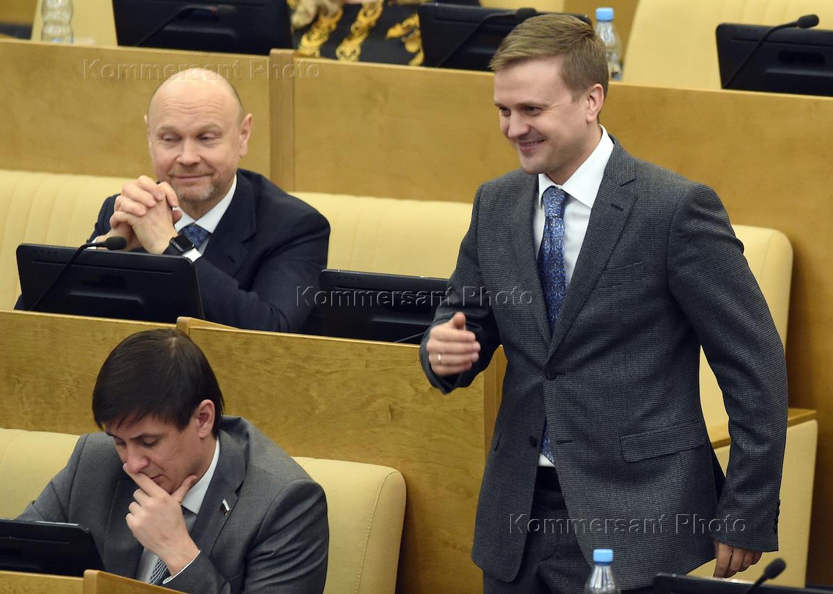 Пленарное заседание Государственной думы (ГД) России. Член комитета ГД России по экономической политике, промышленности, инновационному развитию и предпринимательству Александр Максимов (слева) во время заседания.