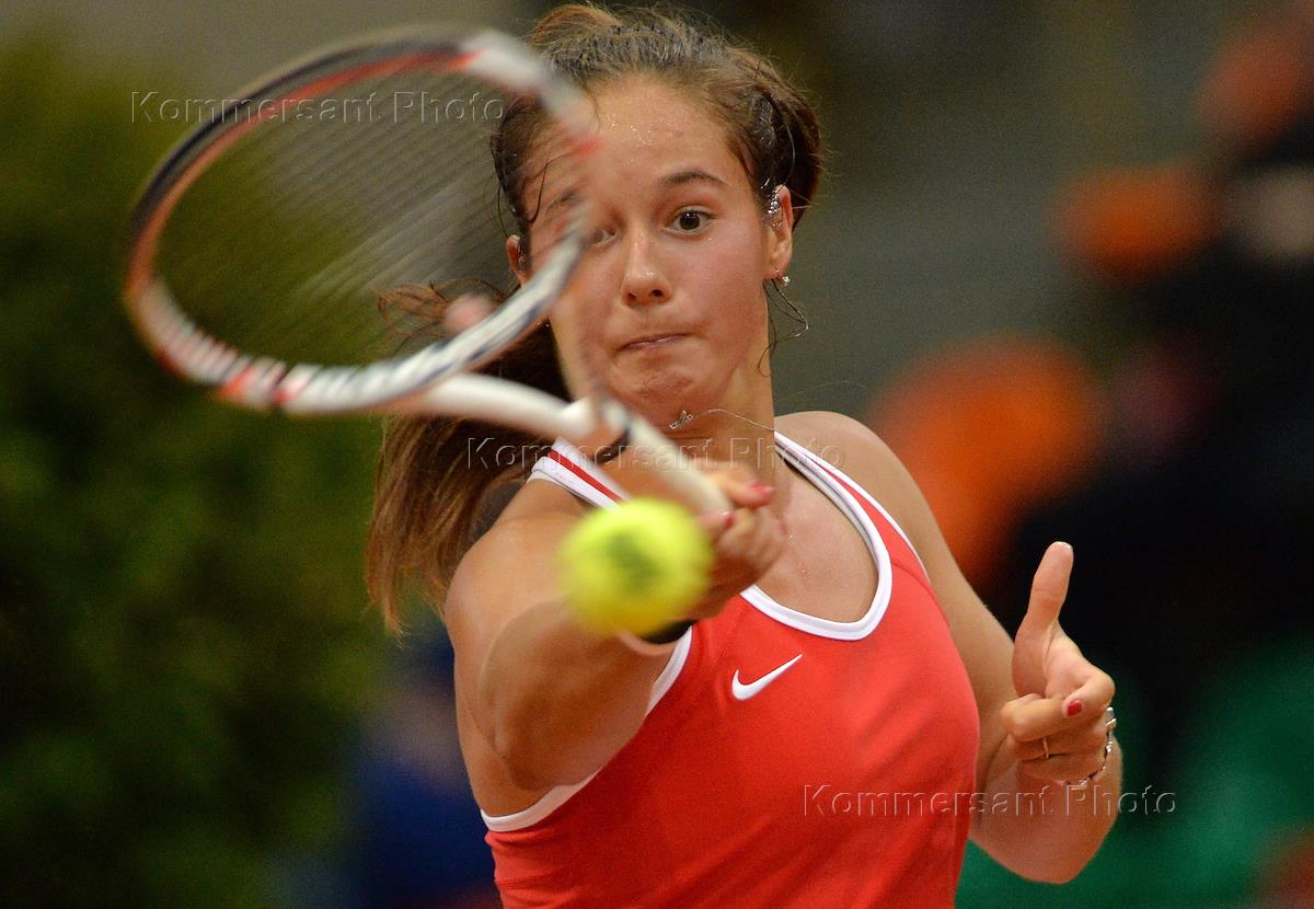 Матч плей-офф командного чемпионата мира по теннису "Кубок Федерации" между женскими сборными командами России и Бельгии на малой спортивной арене "Лужники". Теннисистка Дарья Касаткина во время матча.