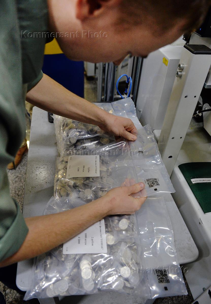Московский монетный двор (ММД). Рабочий маркирует упаковку двухрублевых монет.