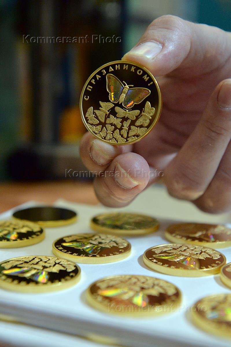 Московский монетный двор (ММД). Рабочий маркирует упаковку двухрублевых монет.
