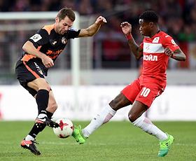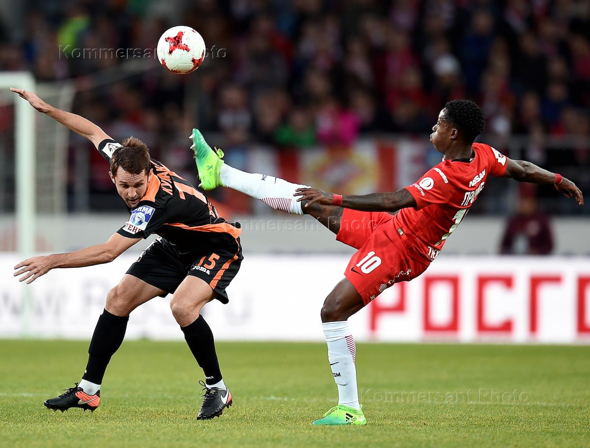 РОСГОССТРАХ Чемпионат России по футболу 2016/2017. 25-й тур. Матч между командами "Спартак" (Москва) - "Урал" (Екатеринбург) прошел на стадионе "Открытие Арена". Игроки команды "Спартак" Квинси Промес (справа) и игрок команды "Урал" Денис Кулаков (слева) во время матча.