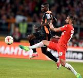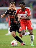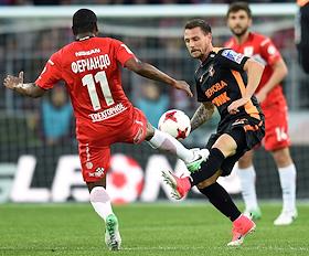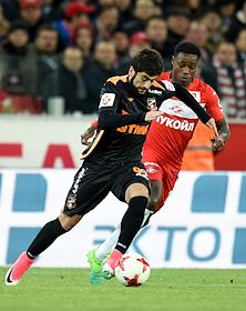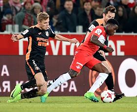 РОСГОССТРАХ Чемпионат России по футболу 2016/2017. 25-й тур. Матч между командами "Спартак" (Москва) - "Урал" (Екатеринбург) прошел на стадионе "Открытие Арена". Игрок команды "Спартак" Александр Самедов (справа) и игрок команды "Урал" Чисамба Лунгу (слева) во время матча.