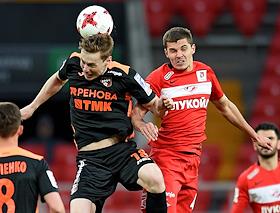 РОСГОССТРАХ Чемпионат России по футболу 2016/2017. 25-й тур. Матч между командами "Спартак" (Москва) - "Урал" (Екатеринбург) прошел на стадионе "Открытие Арена". Игрок команды "Спартак" Роман Зобнин (справа) и игрок команды "Урал" Владимир Ильин (слева) во время матча.