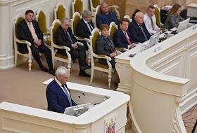 Заседание Законодательного собрания (заксобрания) Санкт-Петербурга. Депутат заксобрания Михаил Погорелов (слева) во время заседания.