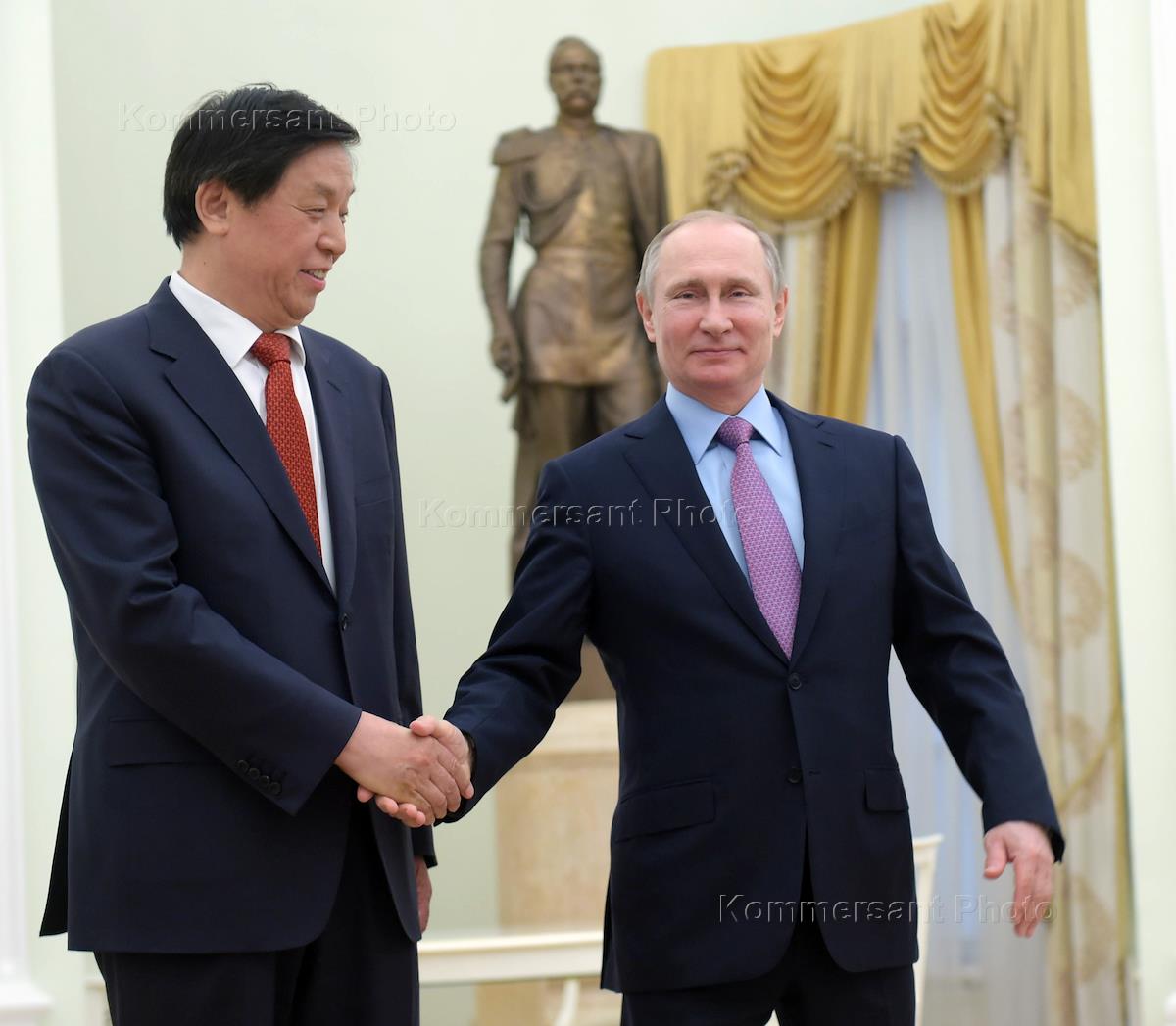 Руководитель канцелярии Центрального комитета Коммунистической партии Китая Ли Чжаньшу (слева) и президент России Владимир Путин (справа) во время встречи в Кремле.