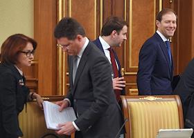Заседание правительства России. Слева направо: министр экономического развития России Максим Орешкин, председатель Центрального Банка России Эльвира Набиуллина, заместитель председателя правительства России Дмитрий Козак и министр энергетики России Александр Новак перед началом заседания.