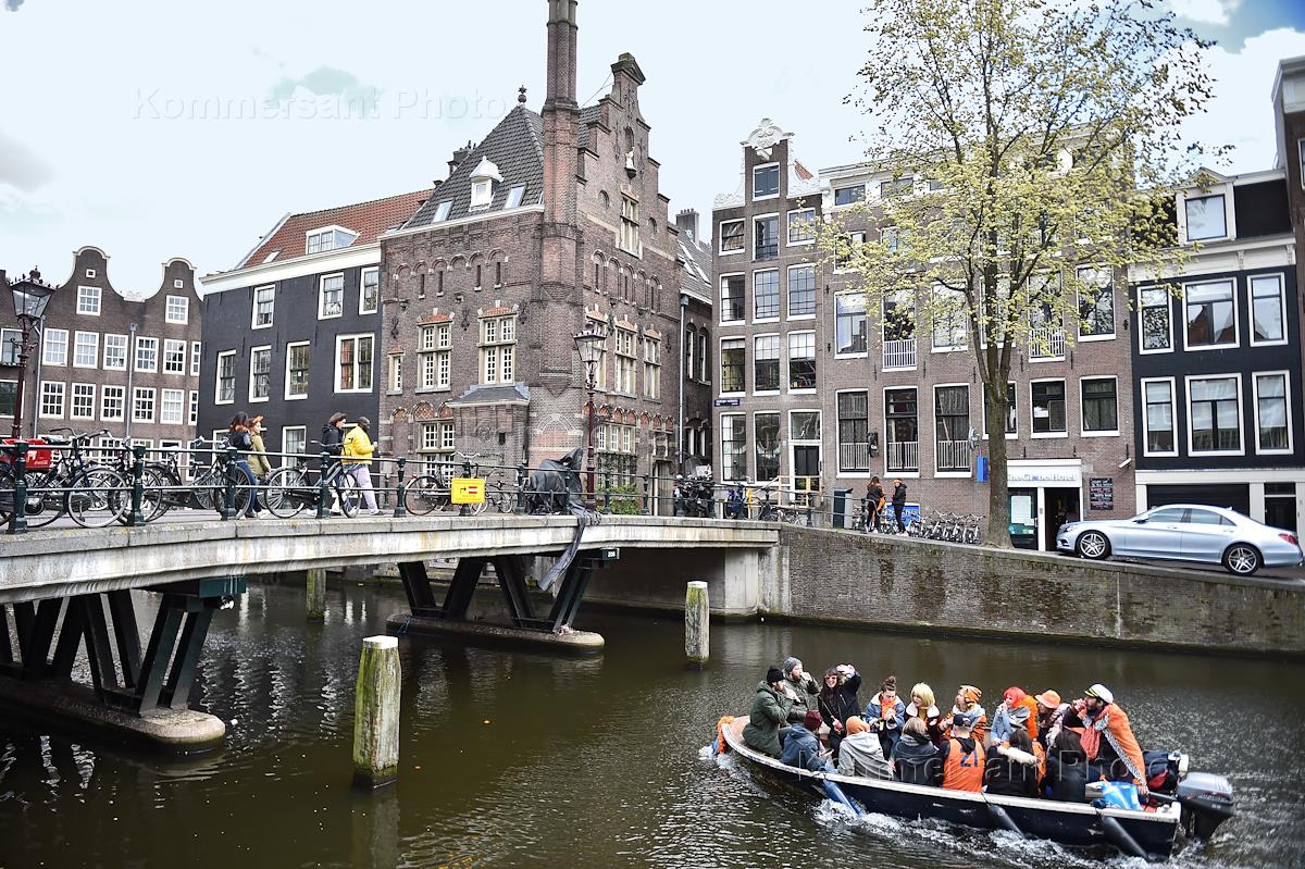 Виды Амстердама. Туристы во время катания на лодке по каналам.