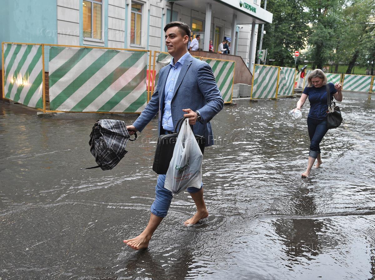 Жанровая фотография. Прохожие, засучив брюки идут босиком по улице, залитой дождем.
