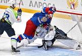 Кубок АЛРОСА. Матч между сборными командами России и Словении. Игрок сборной команды России Александр Барабанов (слева) и игрок сборной команды Словении Клемен Претнар (справа) во время матча.