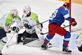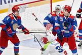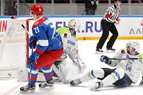 Кубок АЛРОСА. Матч между сборными командами России и Словении. Слева направо: игроки сборной команды России Егор Рыков, Игорь Шестеркин (вратарь) и Михаил Воробьев во время матча.