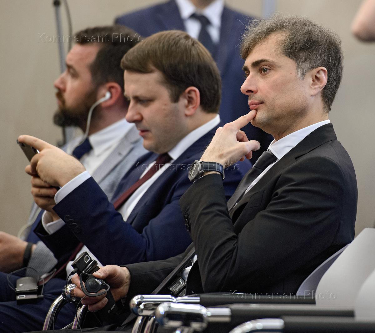 L-R: Economic Development Minister Maxim Oreshkin and Russian Presidential Aide Vladislav Surkov are seen during Russian President Vladimir Putin' meeting with German Chancellor Angela Merkel at Putin's Sochi residence.