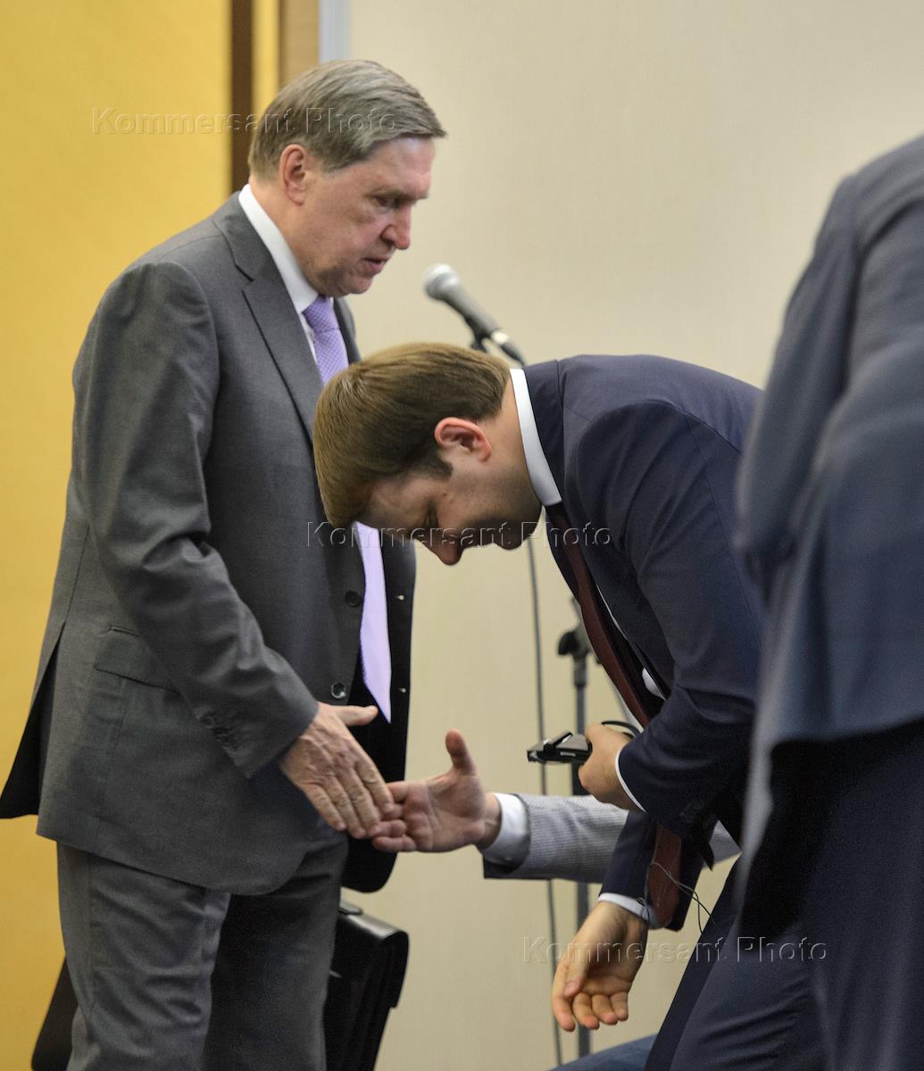 L-R: Russian Presidential Aide Yury Ushakov and Economic Development Minister Maxim Oreshkin are seen during Russian President Vladimir Putin' meeting with German Chancellor Angela Merkel at Putin's Sochi residence.