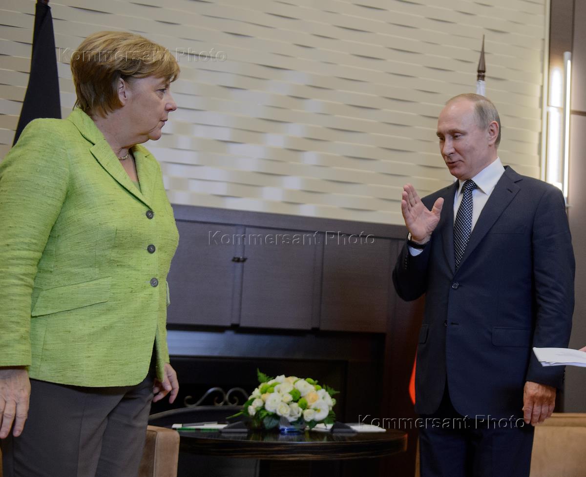 Рабочая поездка президента России Владимира Путина в Сочи. Президент России Владимир Путин (справа) и федеральный канцлер Германии Ангела Меркель (слева) во время встречи.