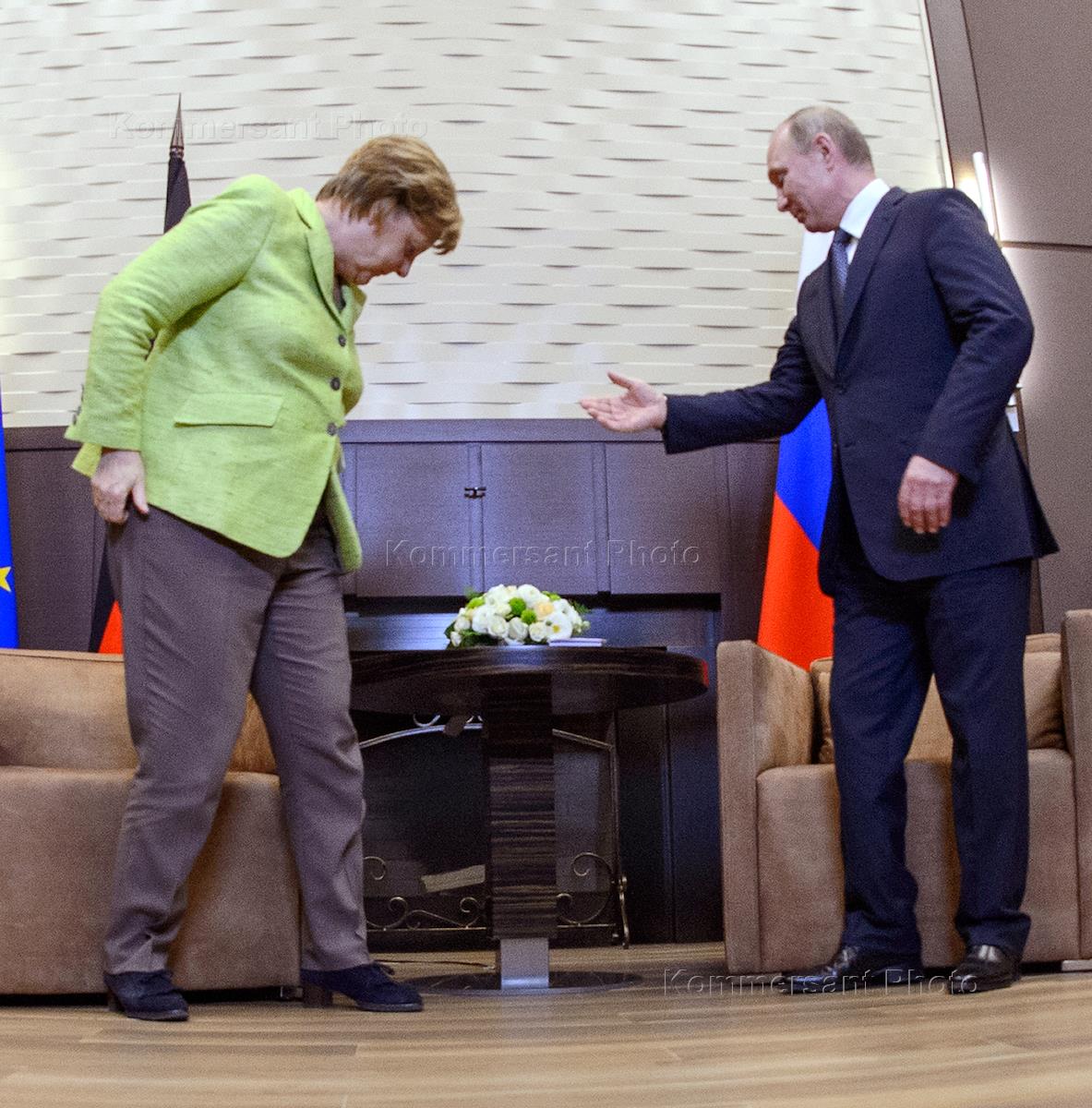 Рабочая поездка президента России Владимира Путина в Сочи. Президент России Владимир Путин (справа) и федеральный канцлер Германии Ангела Меркель (слева) во время встречи в резиденции "Бочаров ручей".